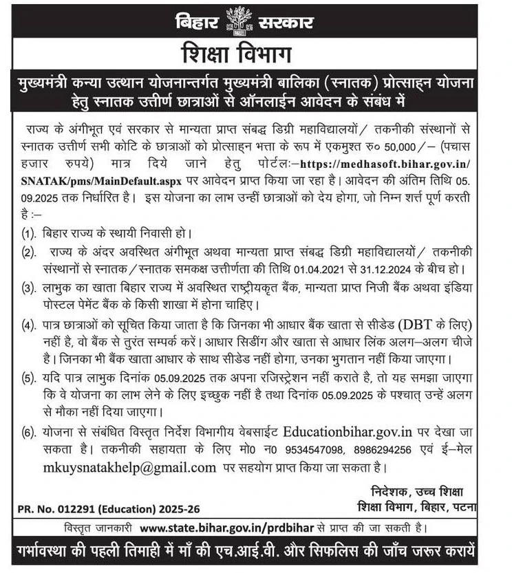 स्नातक पास प्रोत्साहन राशि के लिए आवेदन शुरू | ₹50 हजार के लिए यहाँ से करें आवेदन:-बिहार सरकार ने मुख्यमंत्री बालिका (स्नातक) प्रोत्साहन योजना 2025 के लिए ऑनलाइन आवेदन पोर्टल खोल दिया है। अब राज्य की स्नातक उत्तीर्ण छात्राएँ ₹50,000 की प्रोत्साहन राशि पाने के लिए आवेदन कर सकती हैं।